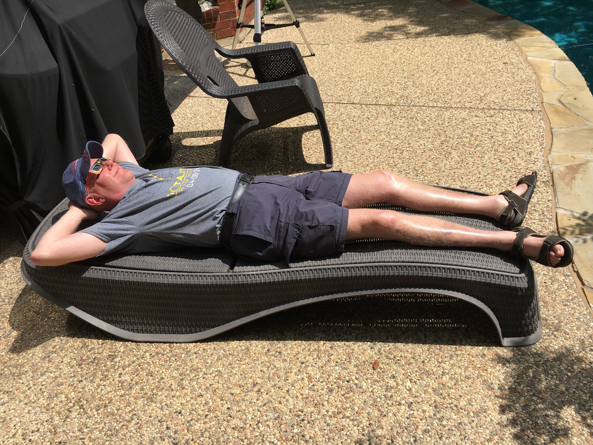 There was a total solar eclipse in April this year, with the line of totality passing directly over my friend's house on the outskirts of Dallas, so three of us took the opportunity for a trip to Texas, culminating in some spectacular astronomy viewed from my friend's garden. Here's me settling in for the big event: